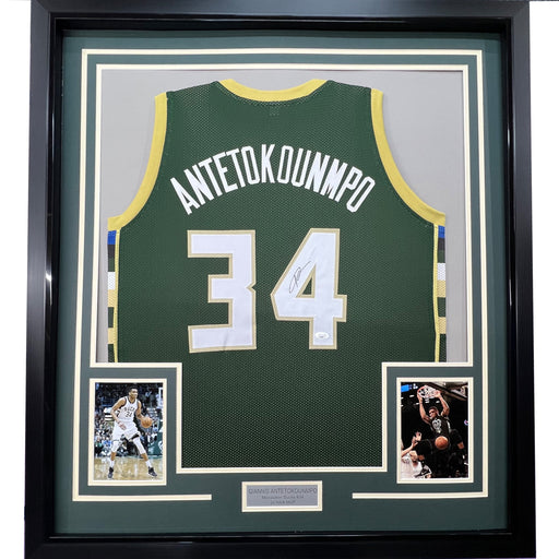 View full detailsFramed Autographed/Signed Giannis Antetokounmpo 35x39 Milwaukee Green Custom Basketball Jersey JSA COA