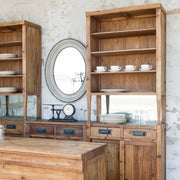 Four upper shelves provide ample space for glassware or curated décor, while the spacious countertop, dual drawers, and lower cabinet storage offer practical organization for entertaining essentials. Crafted from reclaimed pine and tung wood, each cabinet showcases natural character, making every piece truly one of a kind.